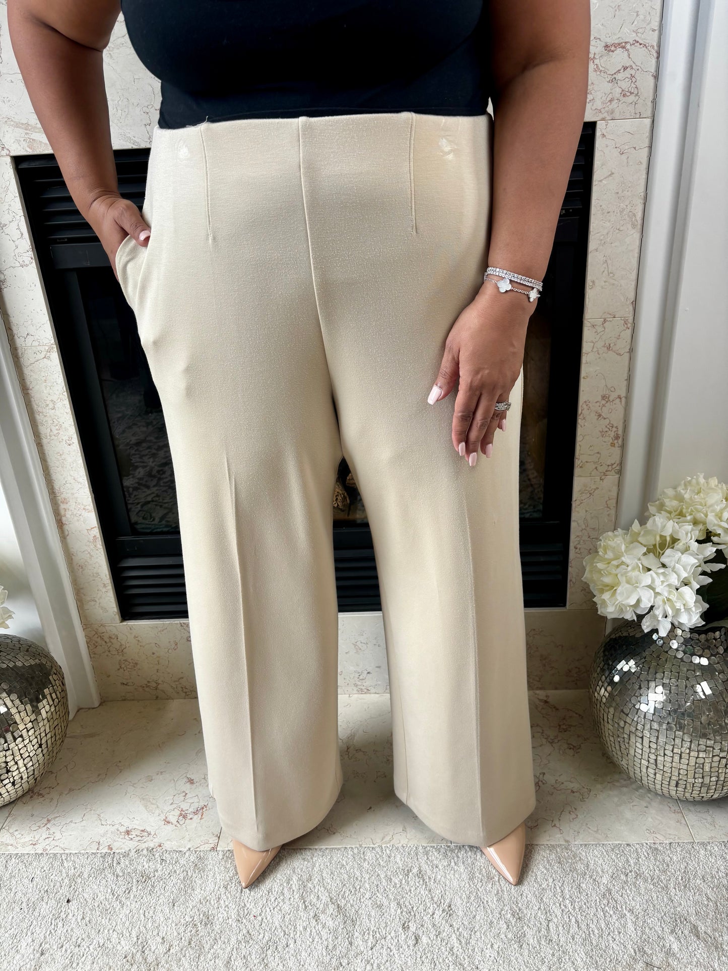 Stretch tan trousers with a high rise, straight leg, and elastic waistband.