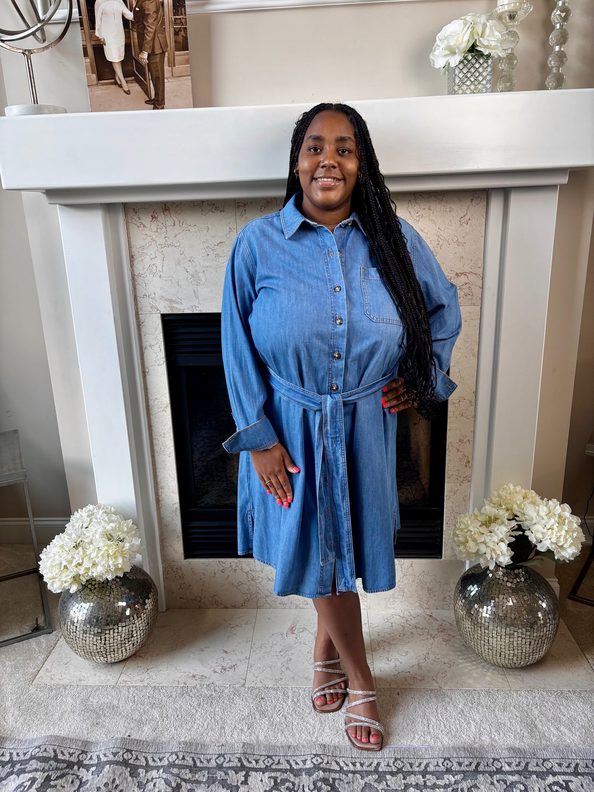 Short denim dress with collar, front pocket, sleeves, and a detachable belt.