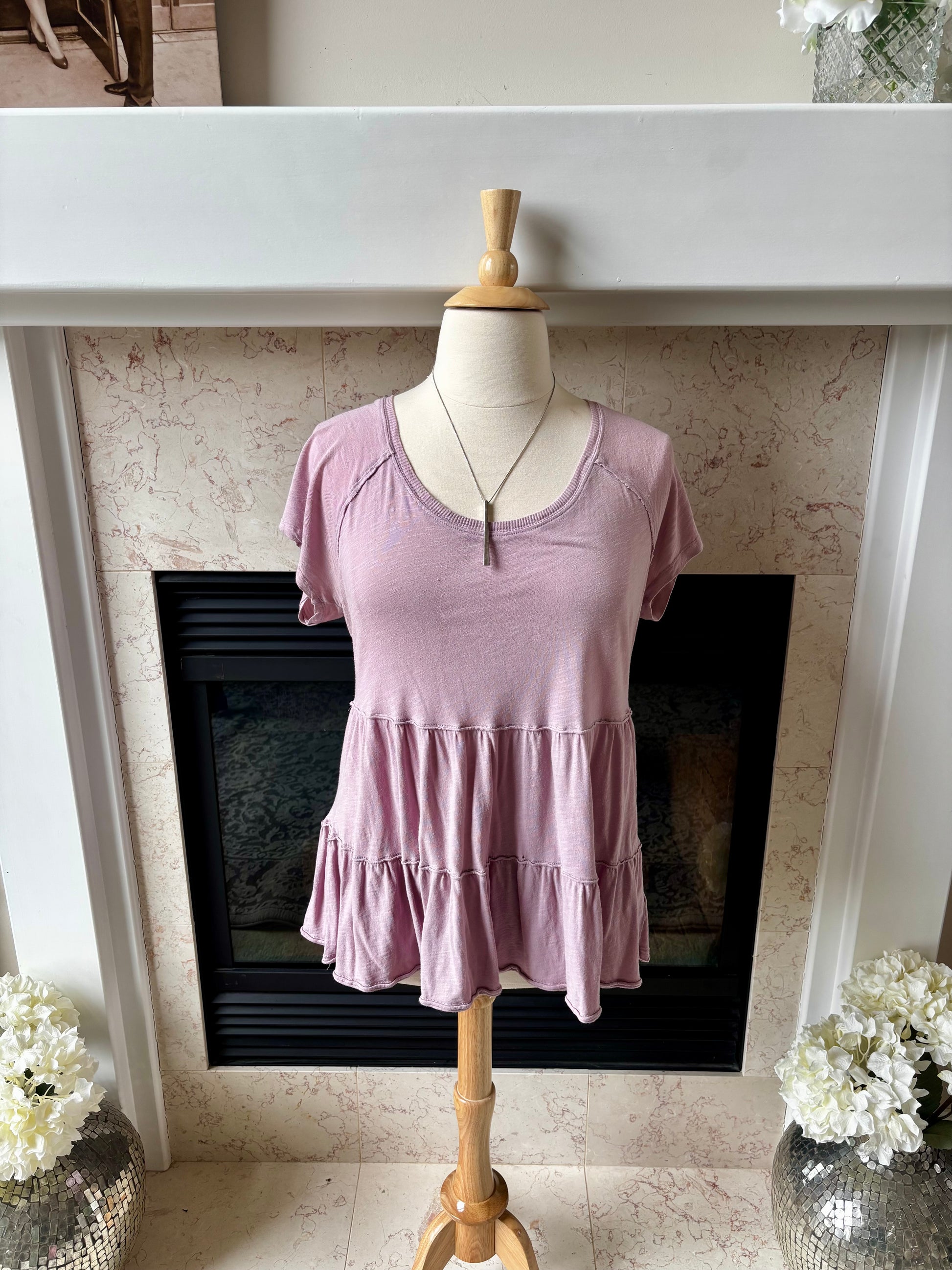Soft pink short sleeve top from Torrid with a flattering V-neckline and ruffled hem. Feminine, fun, and easy to dress up or down. Necklace not included.