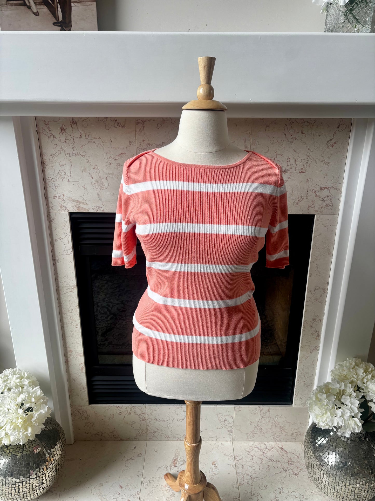 Description: Short sleeve sweater-style top from Lane Bryant in vibrant orange with white stripes. Soft, breathable, and perfect for a pop of color in your wardrobe.