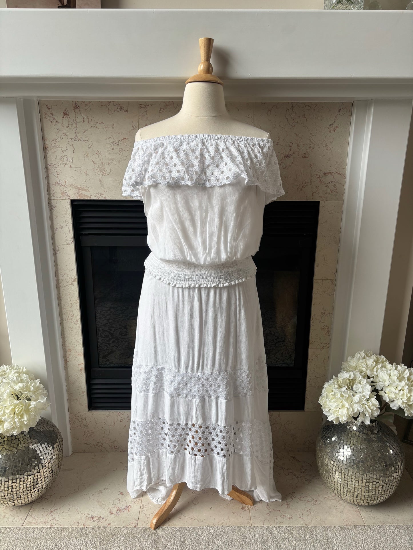 This white two-piece set from Ashley Stewart features a lightweight off-the-shoulder top with eyelet detailing and a matching tiered skirt. Made from breathable fabric, it’s perfect for staying cool and stylish during the summer.
